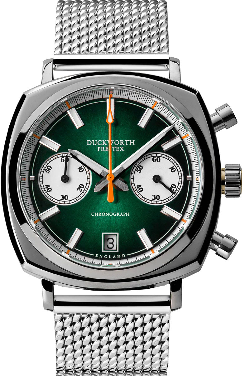 Duckworth Prestex Watch Chronograph 42 Green Sunburst Mesh Bracelet D550-04-ST. Duckworth Prestex watches may sound like a new name, but it goes back a very long time in the history of watchmaking. Nearly 100 years in fact. Neil’s family firm, Prestons, was originally founded in 1869 in Bolton and by the 1920s it was making its own pocket watches under the Prestex name, which enjoyed tremendous success all over the world. Over the next few decades, Prestex produced a variety of timepieces including chronographs, pocket watches and some stunning dress watches.