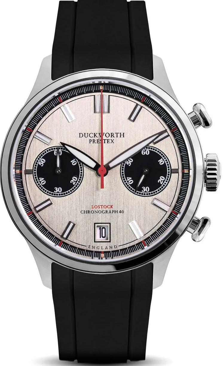 Duckworth Prestex Lostock Silver 40mm Quartz Chronograph Black Rubber Watch