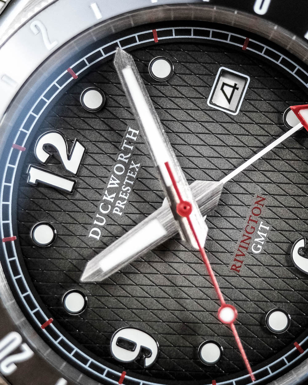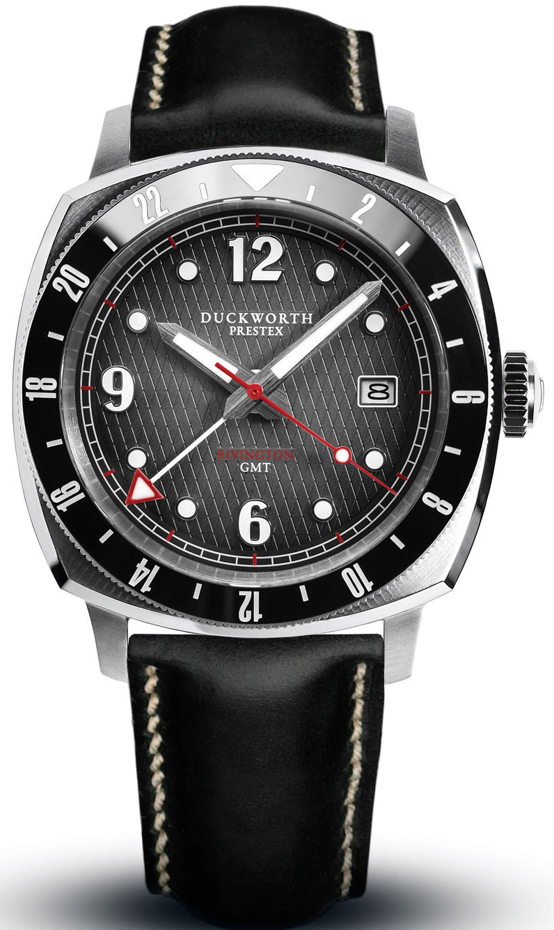Duckworth Prestex Watch Rivington GMT Black Grey Fume Black Leather D489-01-A. The retro cushion-style case is constructed out of durable 316L brushed stainless steel. The Rivington is water resistant to 200m. The black/grey fume dial and distinctive waffle pattern distinguishes the Rivington, whilst the contrasting red second hand and hour markers add a pop of colour to animate the look. Inside the watch we have fitted the ever reliable and robust Miyota 9075 automatic movement.