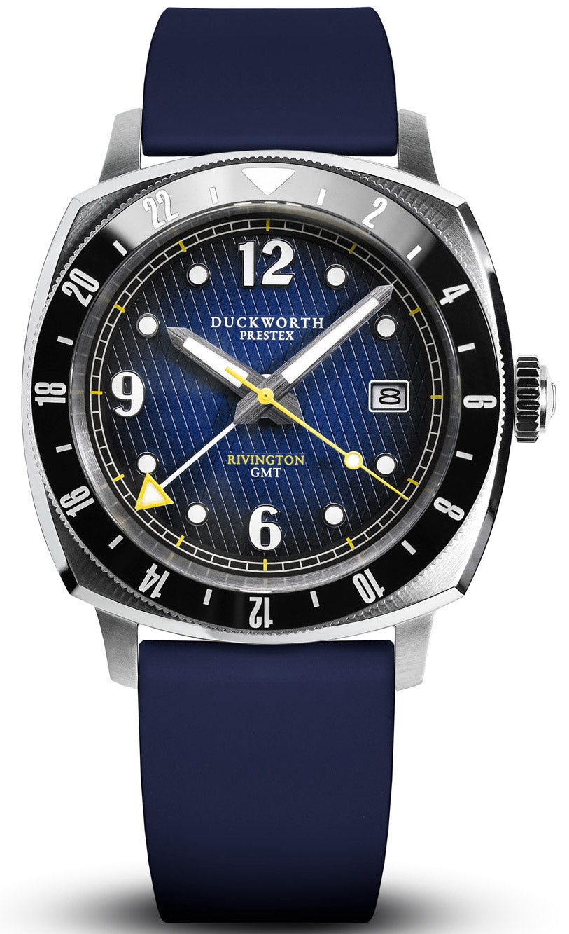 Duckworth Prestex Watch Rivington GMT Blue Fume Blue Rubber D489-03-DR. The blue fume dial and distinctive waffle pattern distinguishes the Rivington, whilst the contrasting yellow second hand and hour markers add a pop of colour to animate the look. Inside the watch we have fitted the ever reliable and robust Miyota 9075 automatic movement.