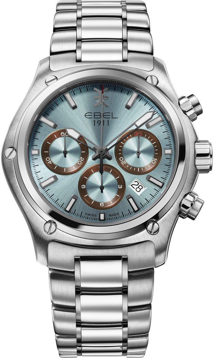 Ebel 1911 Watch 1216680. Men's watch EBEL 1911, stainless steel case, 44mm, ice blue galvanic dial with applied indexes with Super-LumiNova®, date window at 4:30, sapphire crystal with antireflective treatment underneath, sapphire crystal case-back, stainless steel bracelet, folding clasp, comes with additional black calf leather strap, Swiss automatic chronograph movement, water-resistant up to 10 bar.
