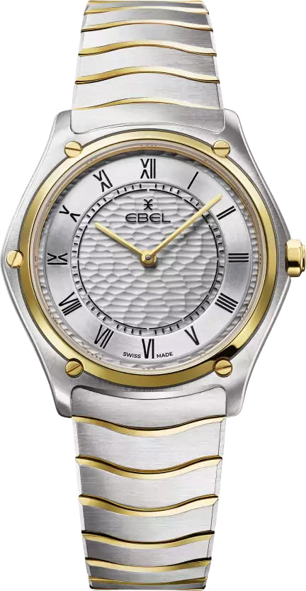 Ebel Sport Classic Watch 1216706. Womens EBEL Sport Classic watch, stainless steel and 18K yellow gold case, 33mm, white silver dial with Roman numerals engraved and painted in black, wave textured pattern, sapphire crystal with antireflective treatment underneath, two tone stainless steel wave link bracelet with a folding clasp, Swiss quartz movement, water resistant up to 5 bar.