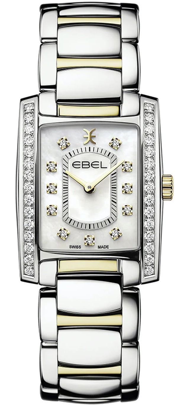 Ebel Watch Brasilia Ladies 1216485. Brasilia, Stainless steel and 18K yellow gold case with 30 diamonds (0.480ct), 22.90mm wide, white mother-of-pearl dial with 11 diamonds (0.0715ct), sapphire crystal with antireflective treatment underneath, stainless steel an yellow gold PVD bracelet, Swiss quartz movement, water-resistant up to 5 bar