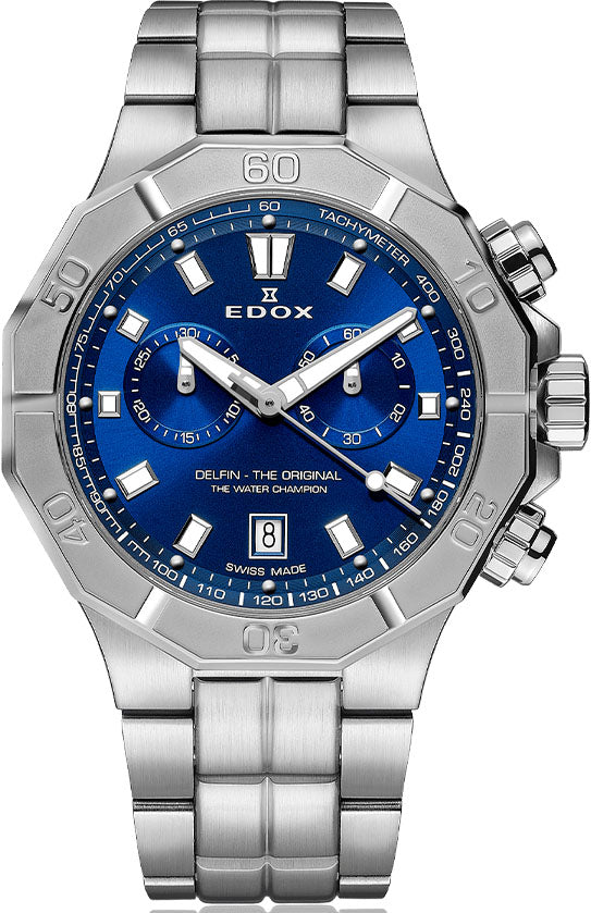 Edox Watch Delfin The Original Chronograph Mens 10113 3M BUIN. Assembled by master watch makers, engineered for champions, for more than 130 years, Edox watches have combined ultimate precision with ingenious solutions, even for the most demanding activities: be it above or below the water surface, in the eternal ice or even on glowing desert sand, any timing instrument from Edox carrying the legendary hourglass logo will meet even the highest demands of its owner.