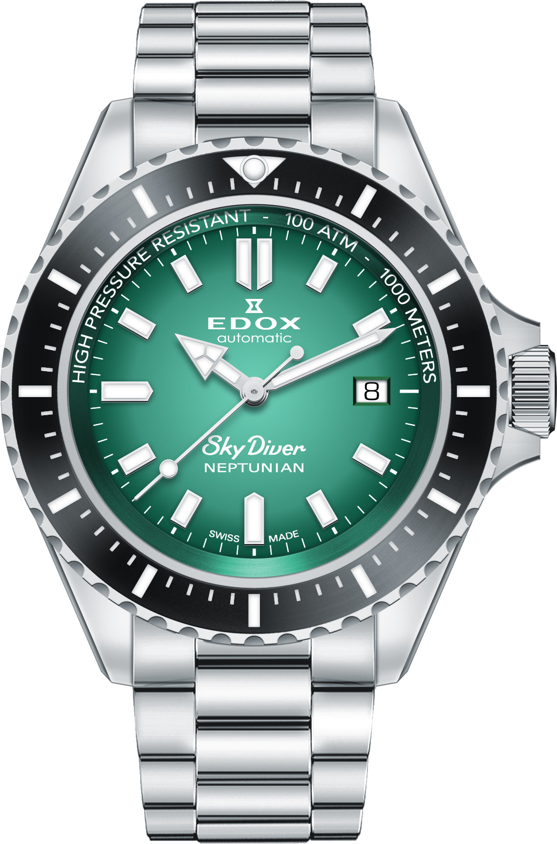 Edox Watch Skydiver Neptunian Automatic 80120 3NM VDN. Assembled by master watch makers, engineered for champions, for more than 130 years, Edox watches have combined ultimate precision with ingenious solutions, even for the most demanding activities: be it above or below the water surface, in the eternal ice or even on glowing desert sand, any timing instrument from Edox carrying the legendary hourglass logo will meet even the highest demands of its owner.
