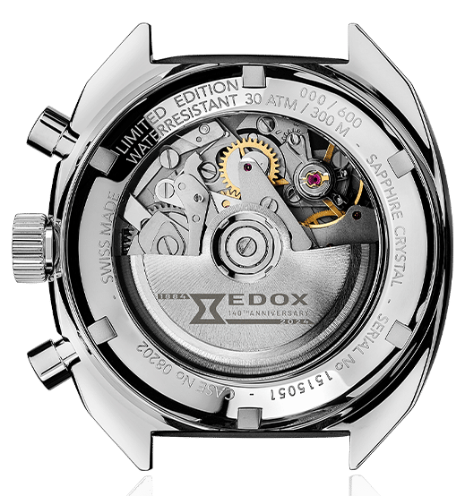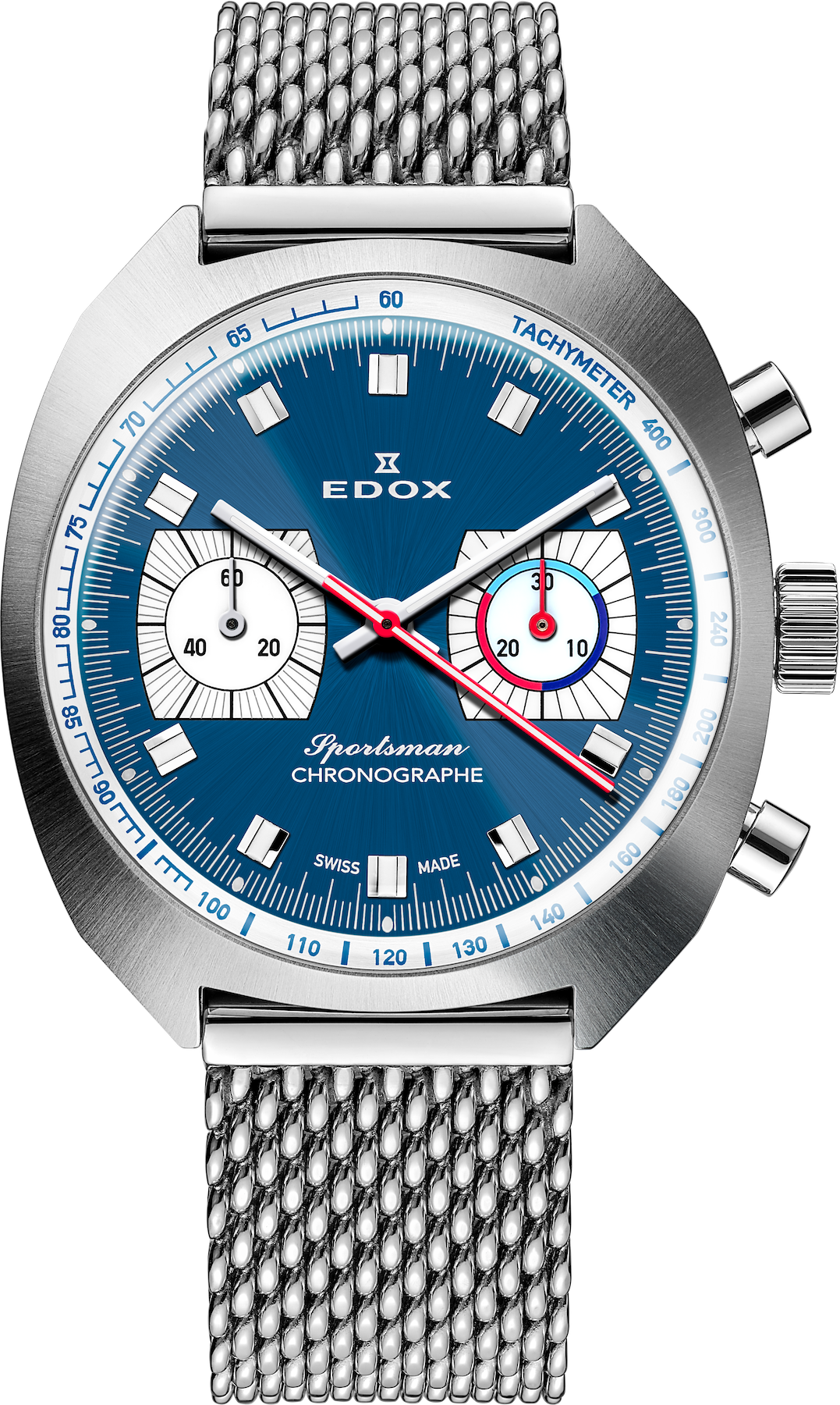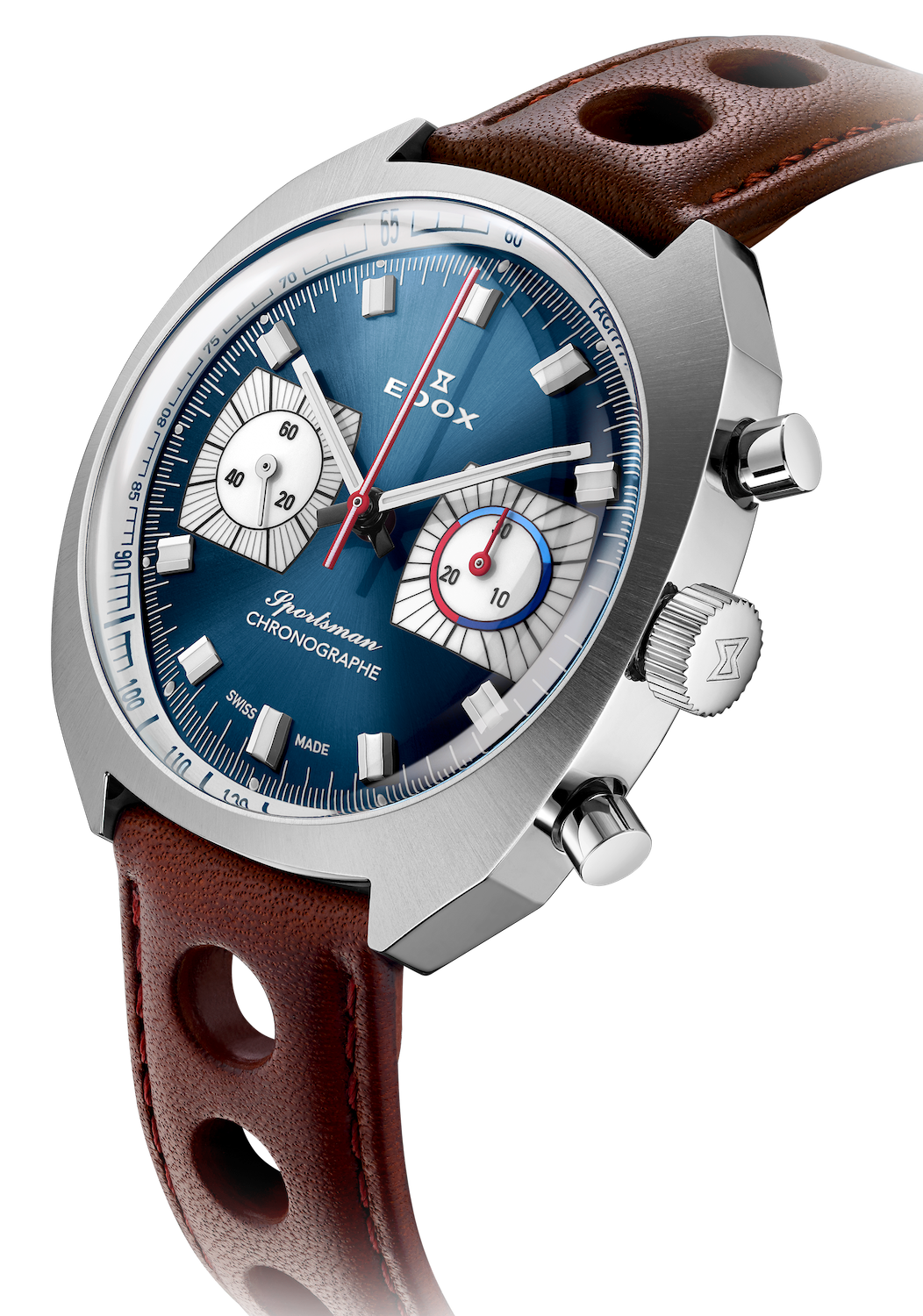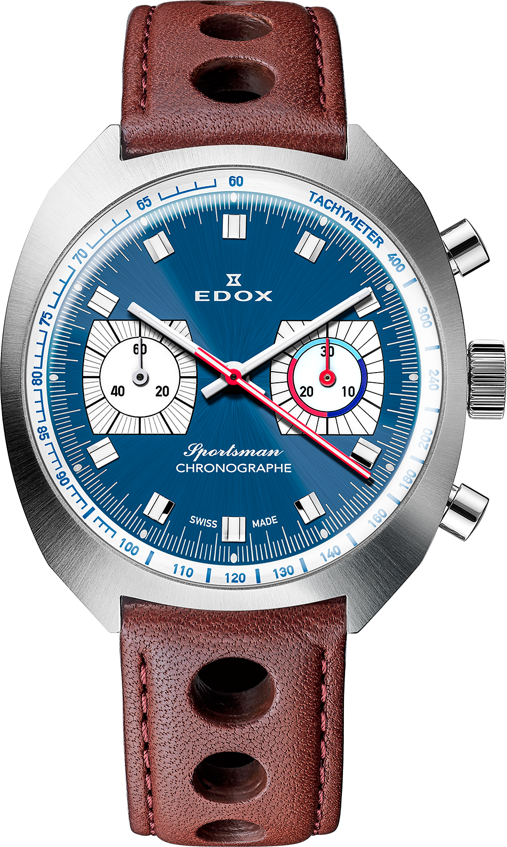 Edox Watch Sportsman Chronographe Automatic Limited Edition 08202-3BU-BUIN. Inspired by the glorious heritage of 1970s motorsport and the original model from 1972 the Edox Sportsman Chronographe Automatic, embodies the competitive essence and elegance of that legendary age.