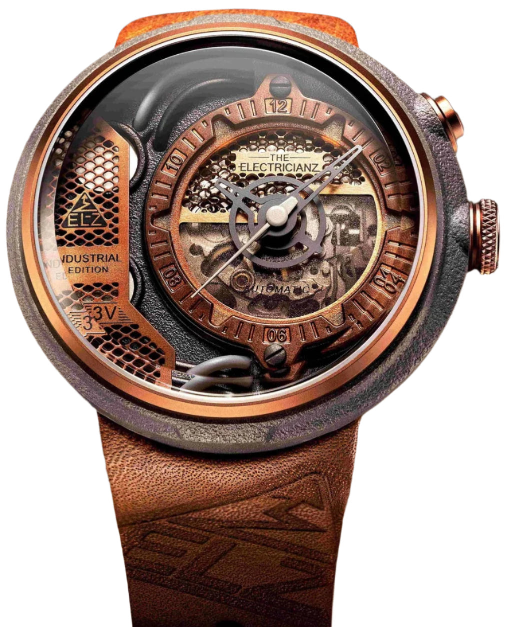 Electricianz Watch The Copper X Edition ZZ-D1C/02-CLC. The Copper X Edition is a harmonious blend of tradition and technology, featuring a 42H Power Reserve Skeleton Mechanical and our patented In-House Module with 8 Orange LEDs, all powered by dual Lithium Batteries.