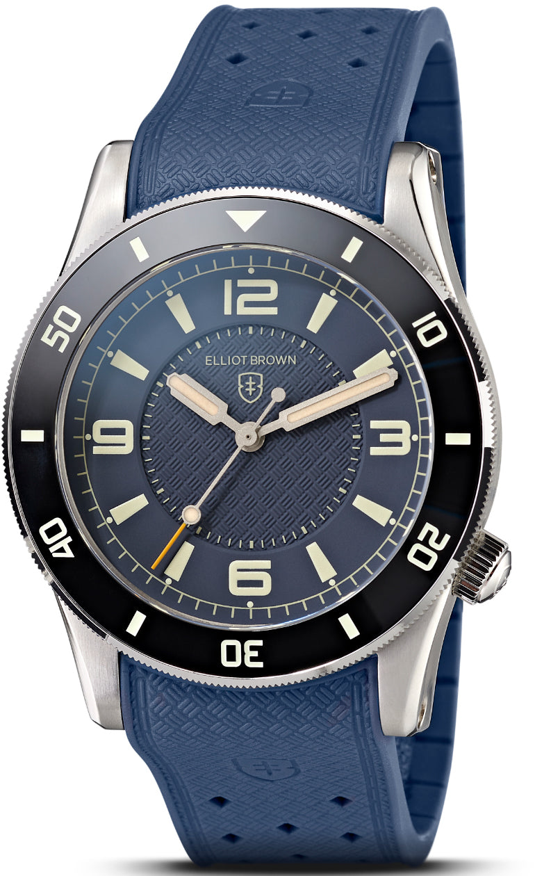 Elliot Brown Watch Bloxworth 3 Hand Diver 929-103-R53S. The Elliot Brown watches Bloxworth 3 Hand Diver is a beautiful dive watch inspired by classic watches from the 50s and 60s, demanding audience. Take the basketweave pattern; Elliot Browns take on the iconic Tropic watch straps incorporated neatly into the dials, case backs and soft deploymant rubber straps.