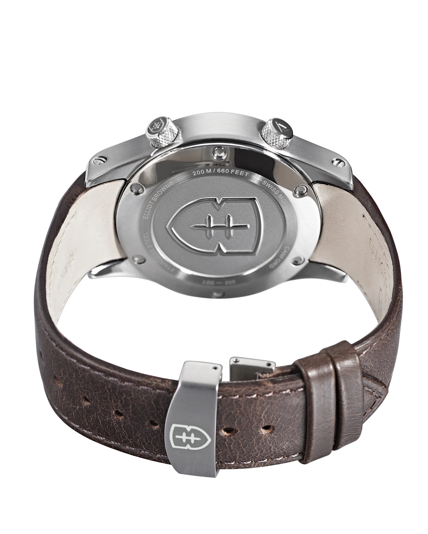 Elliot Brown Watch Canford 202-003-L08. The Canford is quietly handsome, for those who don't want their watch to shout too loudly. It has the elegance of a classic pilot's watch but with broader shoulders. It is the sort of watch you need never take off, no matter how tough the conditions or how smart the suit.