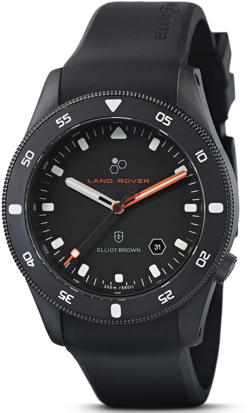 Elliot Brown Watch Holton Land Rover x Elliot. The Elliot Brown watches Land Rover x Elliot Brown Holton was created alongside Jaguar Land Rover design personnel to become the perfect fit for purpose watch for active lifestyles. The finer details of this model really shine through the closer you get to it, with numerous design touches carried over from the new Land Rover Defender including the hexagonal detailing and the squircle shaped hour markers. Look carefully at the dial and you'll spot orange micro markers at 19 and 48, significant because it was the year the first Land Rover was launched.