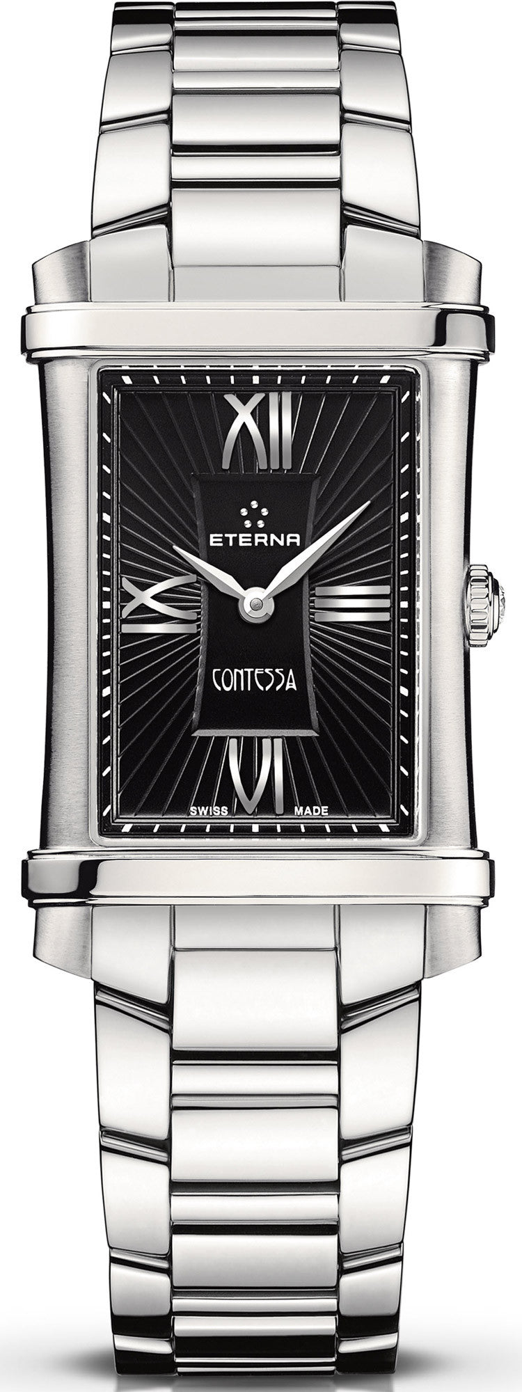 Eterna Watch Contessa. This discreet ladies timepiece from masters of Swiss precision, Eterna is characterised by ingenious creativity. With unique dimensions of 40 x 25.75mm, its attractive rectangular profile is not only stylish but embodies a sense of durability and resilience. Like so many Eterna watches, this black model with delicately carved hour and minute indices in a silver hue, evokes sophistication yet with bucketfuls of femininity. Eterna watches are proud of their beautiful Contessa collection which reflects the brands respect for tradition, alongside a strong commitment to pioneering new designs. If you are a lady looking for a new timepiece to compliment your smart office attire and give you that little added sense of professionalism, the Eterna Contessa black model sits pleasantly on the wrist thanks to its highly refined 316L stainless steel bracelet with foldable clasp and emits a confident presence without any over fussiness. The silvered Roman numerals at the 12, 3, 6 and 9 o clock locations allows for the watch to transform into something rather special at night, its fine detailing complimenting a black evening dress perfectly when matched with accompanying silver jewellery. The timepiece is also developed to withstand water depths of 50 meters. Supplier model number 2410.41.45.0264