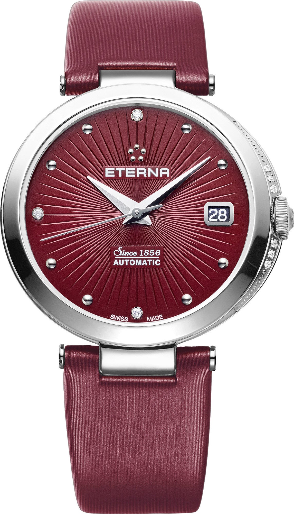 Eterna Watch Grace. The Grace collection from Eterna watches is highly feminine and self assured. This particular model features the utmost attention to detail in aspects such as its delicate ball bearing hour indexes and burgundy dial which expresses a splayed guilloche texture emanating from the centre of the face. The Eterna Grace model bears a perfectly round solid stainless steel bezel which showcases 6 endowed diamonds around the screw in crown. A 34mm dial diameter allows for the date aperture at 3 o clock and the Eterna watches brand lettering and logo to sit in perfect equal proportions to eachother, enhanced by a mulled red wine satin strap with stainless steel tang buckle. The dial of the Etern Grace watch is protected with a scratch resistant and anti reflective sapphire crystal glass front which also ensures that the automatic movement, the Sellita calibre SW200-1 is protected from 50 meters of water resistance. Supplier model number 2944.54.76.1334