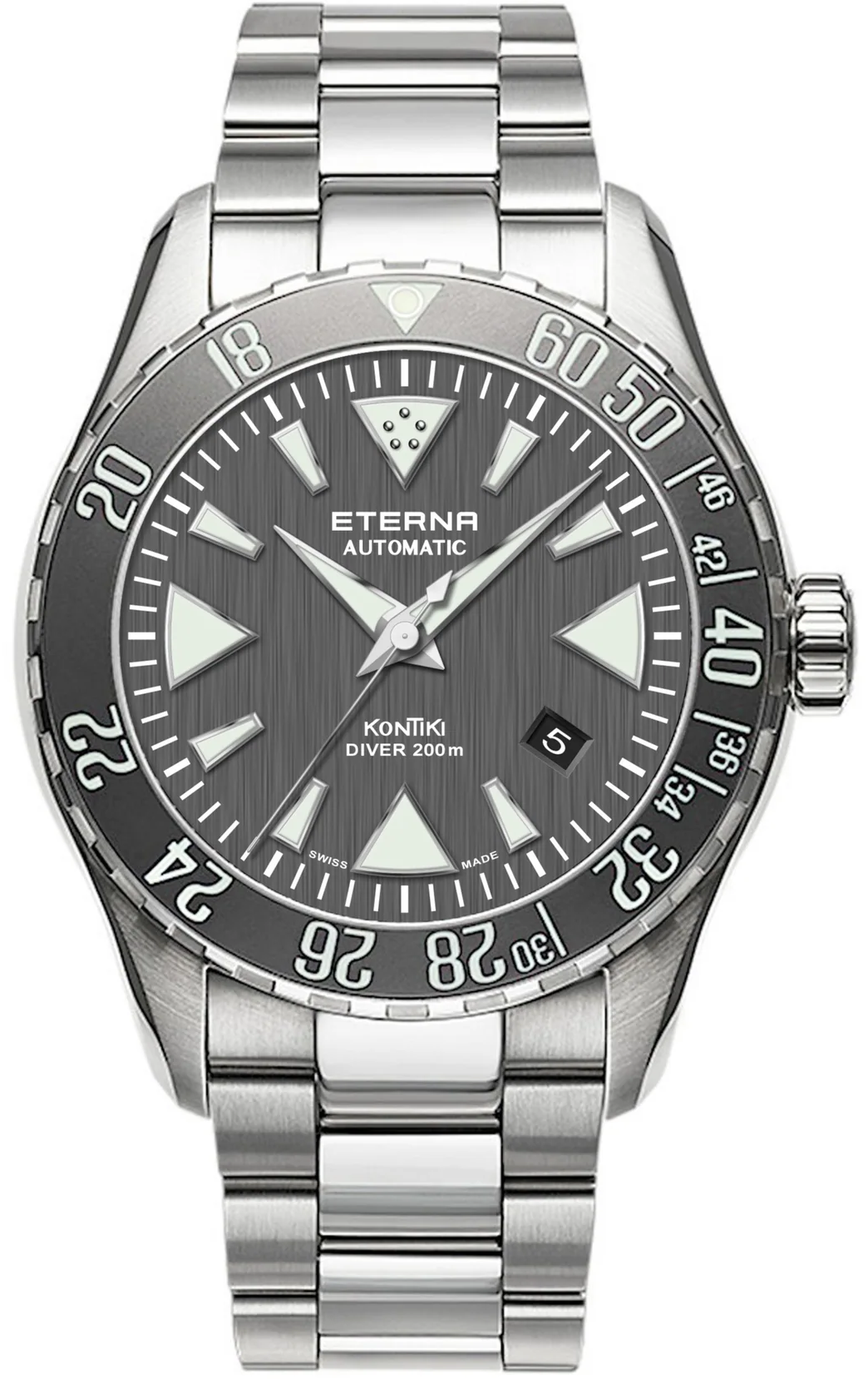 Eterna Watch KonTiki Diver Silver 1292.41.49.1753. The inspiration for the watch itself comes from a vintage Eterna dive watch from the 1970s. Divers at the time used no decompression tables developed by the US Navy to determine how many minutes they could safely spend at each depth and still go directly to the surface. By adhering to these tables, divers could avoid having to pause for decompression during ascent and ward o the bends.