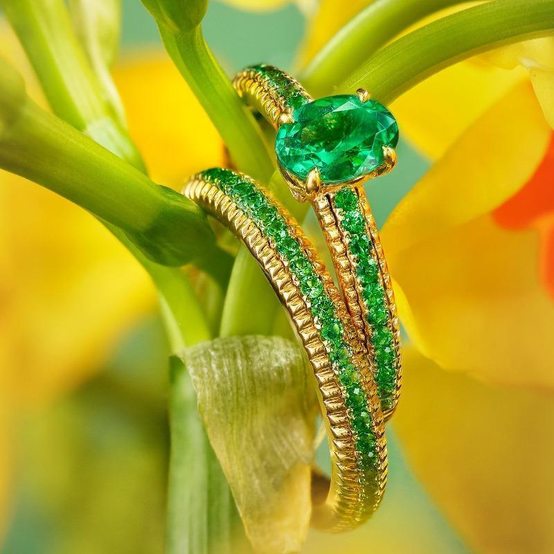 The Faberge Colours of Love 18ct Yellow Gold Emerald Fluted Ring features a central oval cut 7x5mm green Emerald gemstone, totalling 0.75ct, claw set in 18ct yellow gold. Set in 18ct fluted yellow gold, the Ring is further embellished with 21 round tsavorites totalling 0.23cts. In keeping with its fondness for delight, surprise and discovery, Faberge has concealed a Gemfields Ruby on the inside of the band (0.02ct).