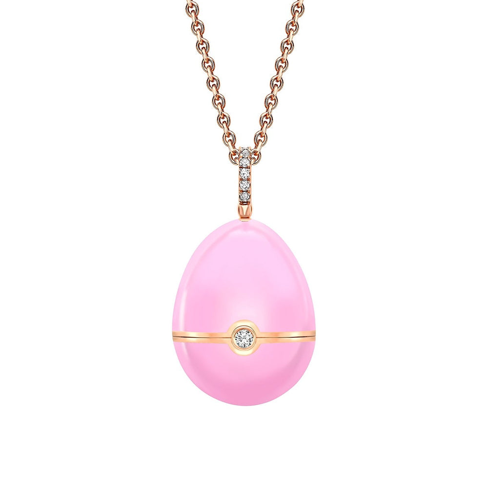 The Faberge Essence Rose Gold Pink Lacquer Heart Surprise Locket set in 18ct gold and hand-painted in a pink lacquer. Finished with a diamond bail and a striking heart shaped pink sapphire, this feminine design is the perfect gift to celebrate love, friendship or special life moments.