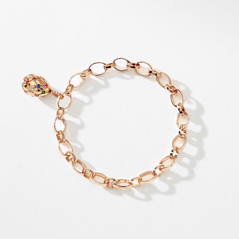 The Faberge Treillage Multi coloured Rose Gold Polished Charm is a stunning piece to start or add to a collection. The Faberge charm collections are designed for you to enjoy the signature eggs in a fun and playful way by creating your own charm bracelets or necklaces. This charm features round white diamonds, rubies, amethysts, pink and blue sapphires, tsavorites and fire opals, set in 18 carat polished rose gold. The egg charm is 14mm.