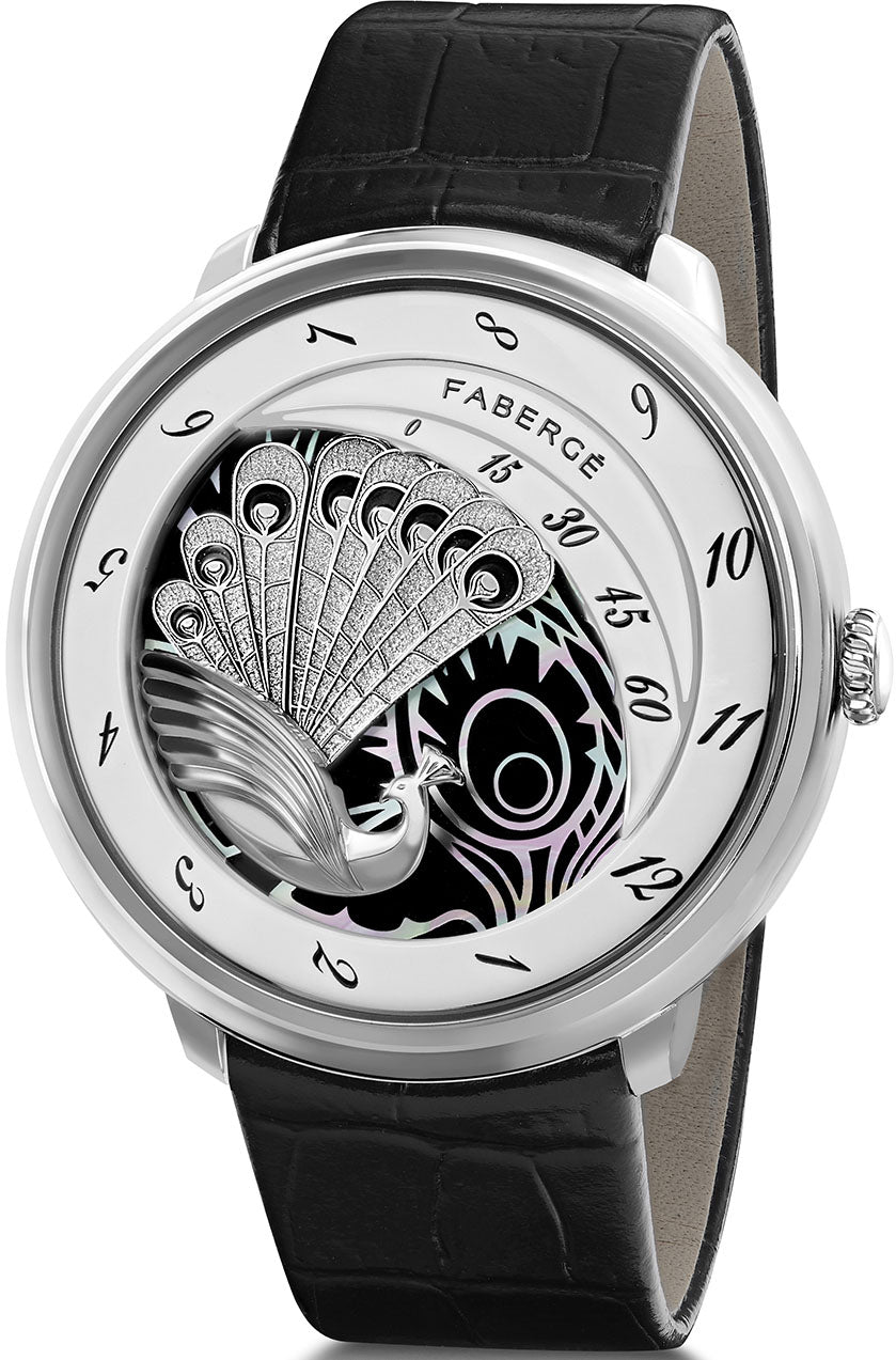 Faberge Watch Compliquee Peacock Arte White Gold Black White Limited Edition 2816/1. Limited to ten numbered pieces, each watch dial is unique; engraved by a technique known as ‘eau forte’, or ‘etching’, an ‘intaglio’ print-making process dating back to the 16th century, in which an image or design is incised onto a plate using acid.