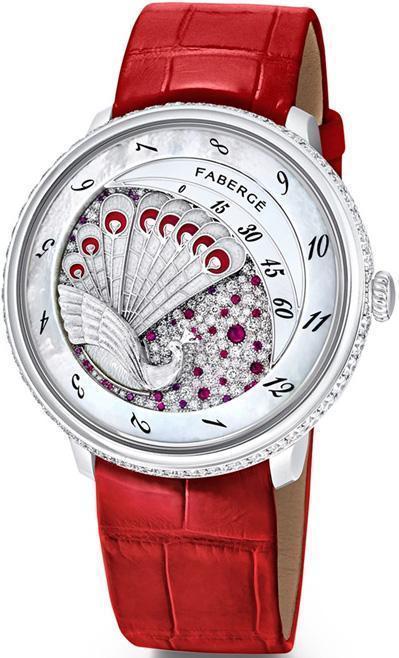Faberge Watch Lady Compliquee Peacock Ruby 1687. Lady Compliquee Peacock Ruby Timepiece features a dial set with diamonds and rubies, hand engraved peacock in 18ct white gold, diamond set bezel, minute and hour indicators in mother of pearl and a retrograde hand winding movement, encased in a 38mm platinum case, with alligator strap.
