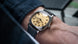 Fears Watch Brunswick Champagne. As its name suggests, this new watch features a rich champagne coloured dial, created using layers of 18ct Yellow Gold on a surface which has undergone frosting using glass beads. This type of frosted finish has a gentle sparkle to it which complements the true gold colour. The applied ‘Edwin’ numerals are diamond polished before receiving a coating of black gold, giving them a dark, warm contrast to the bright gold tones of the dial. The Brunswick Champagne is paired with a handmade Pewter Grey strap crafted from premium Barenia leather which lends a contemporary feel to the watch.