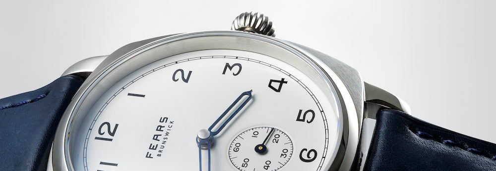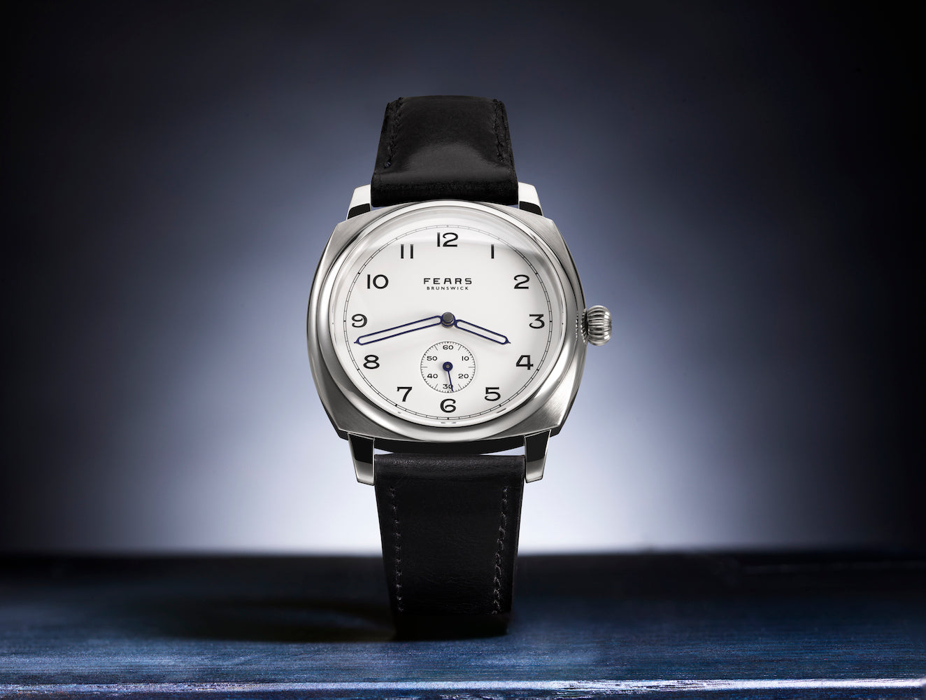 Fears Watch Brunswick White. Hand built in Britain. Graceful and complex, the curvaceous Brunswick is an exacting object to create. It takes its inspiration from a gentleman’s cushion case watch in the Fears archives, first made in 1924.