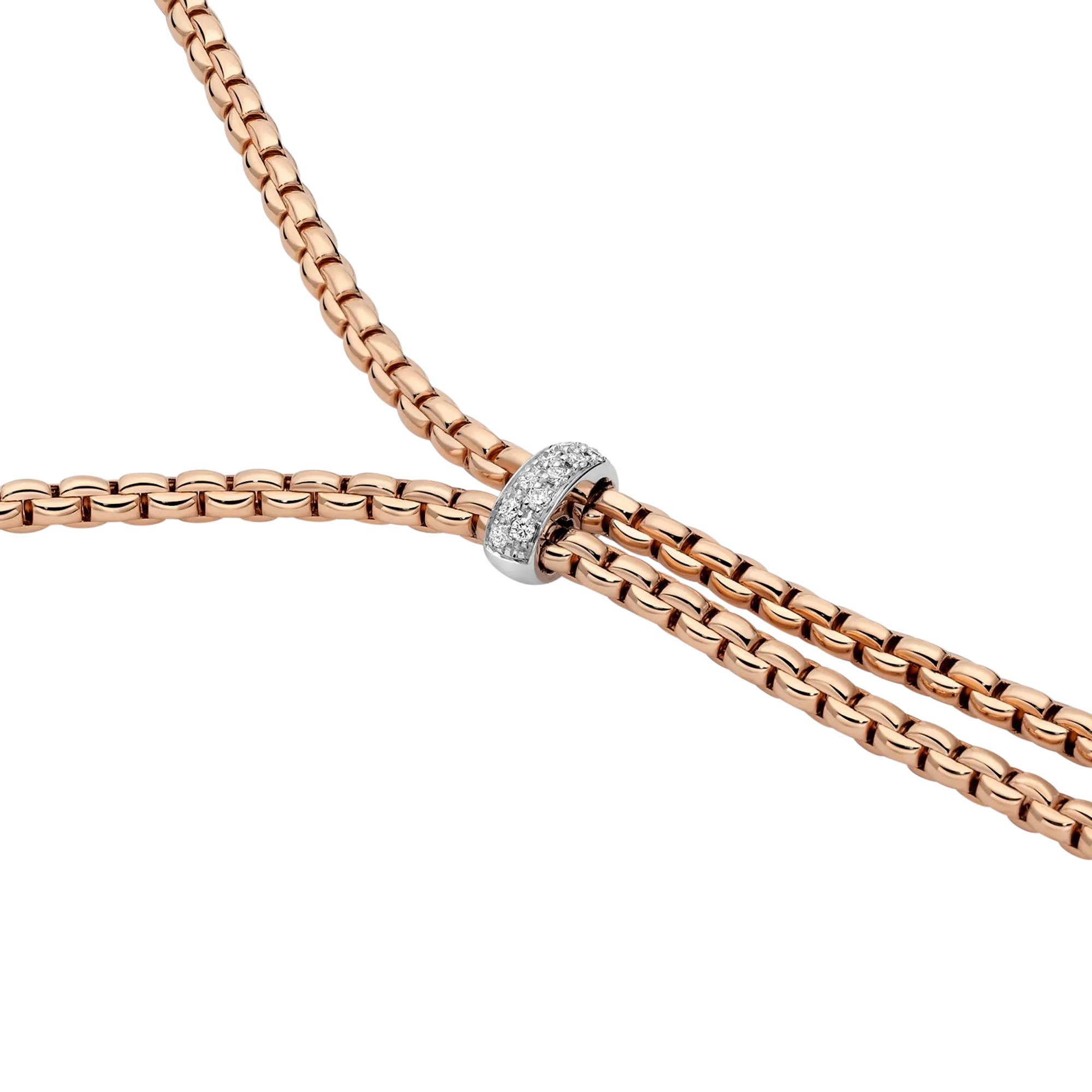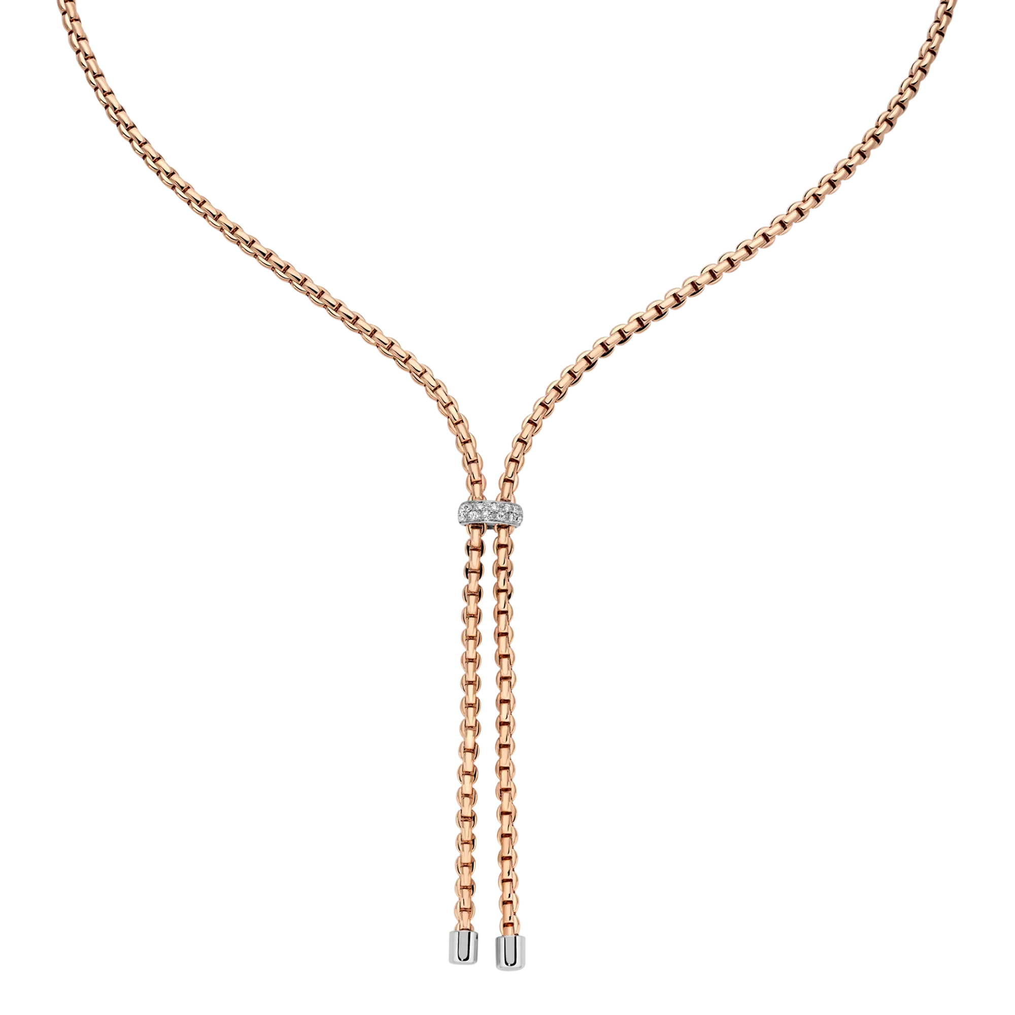 This elegant necklace features 18ct rose gold and a 0.10ct of diamonds, embodying a beautiful and timeless creation from Fope.