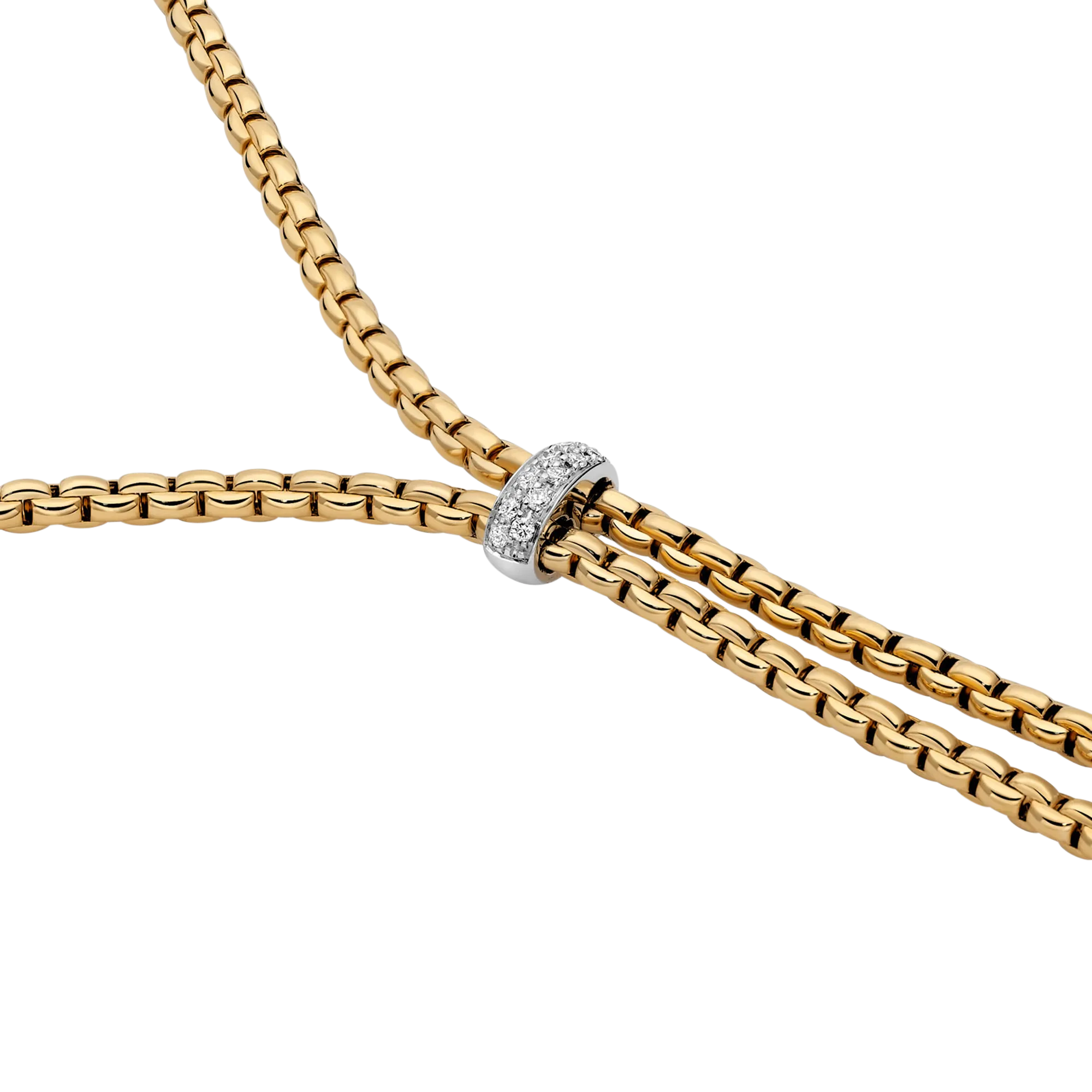 Crafted from 18ct yellow gold and adorned with 0.10ct of diamonds, this Eka necklace by Fope is an exceptional choice for those seeking elegance and sophistication in their jewellery.