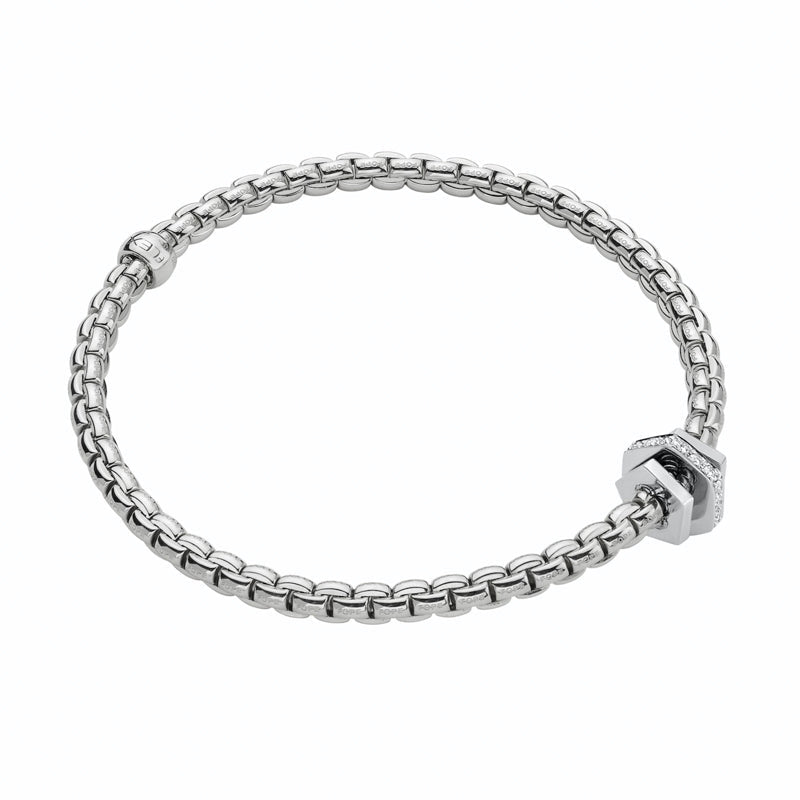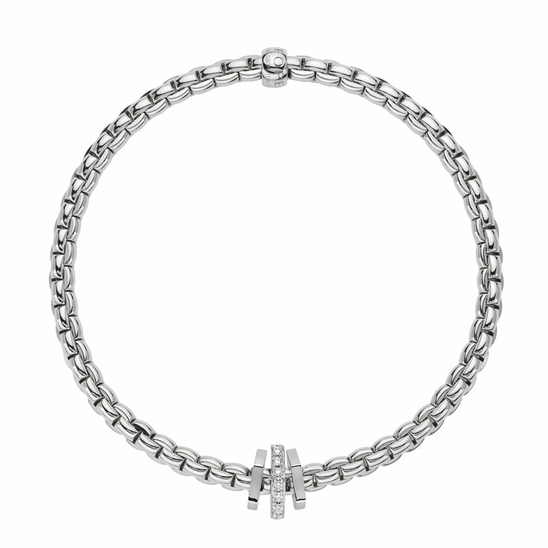 This Fope bracelet comes from the Eka collection and features the renowned Flex'it design. The expertly woven 18ct white gold chain features 18ct white gold rondelles, the centre rondelle being embellished with 0.15cts of sparkling brilliant cut diamonds. . The bracelet is clasp free for convenience.