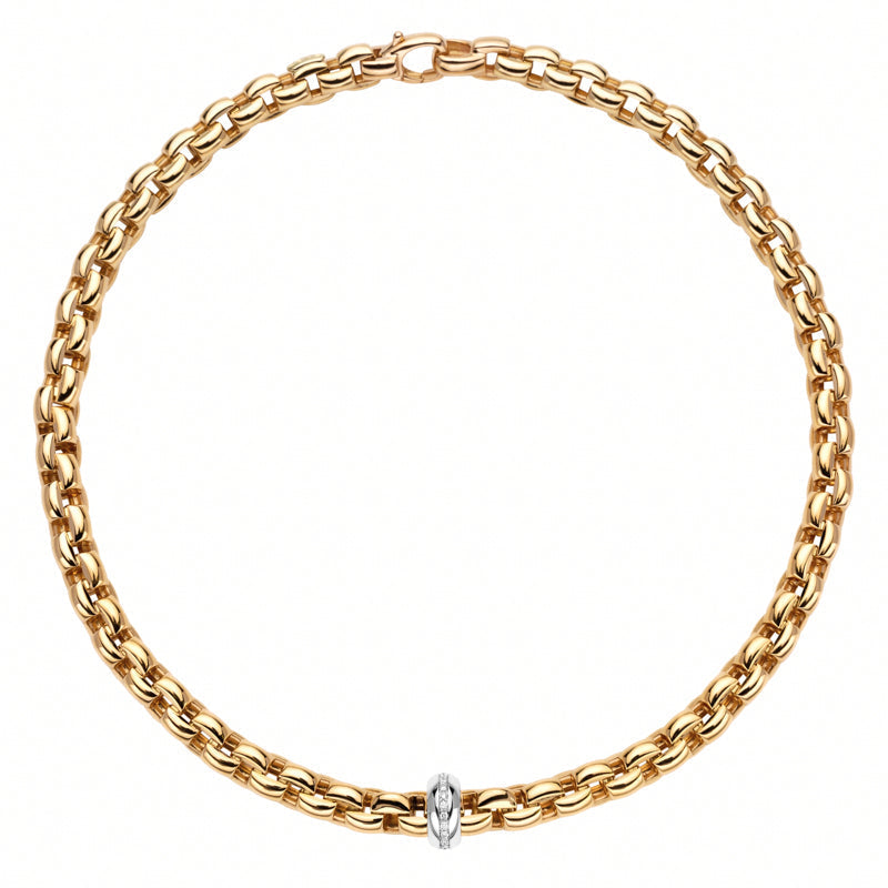 This stunning necklace is part of the Fope Eka collection and features a finely crafted 18ct yellow gold chain. The necklace features a single 18ct white gold rondelle which is embellished with 0.19cts of sparkling brilliant cut diamonds. This piece is completed with a simple lobster clasp for secure and easy wear.