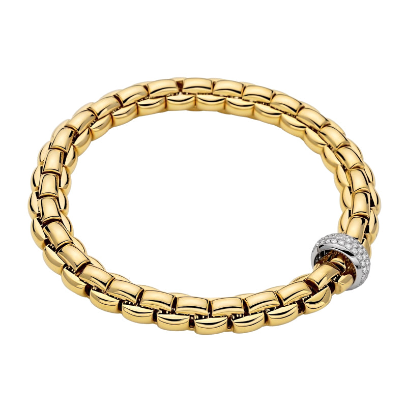 This stunning bracelet is part of the Fope Eka collection and features a finely crafted 18ct yellow gold Flex'it stretch design. The bracelet features a single 18ct white gold rondelle which is embellished with 0.58cts of sparkling brilliant cut diamonds. This bracelet is clasp free for convenience.