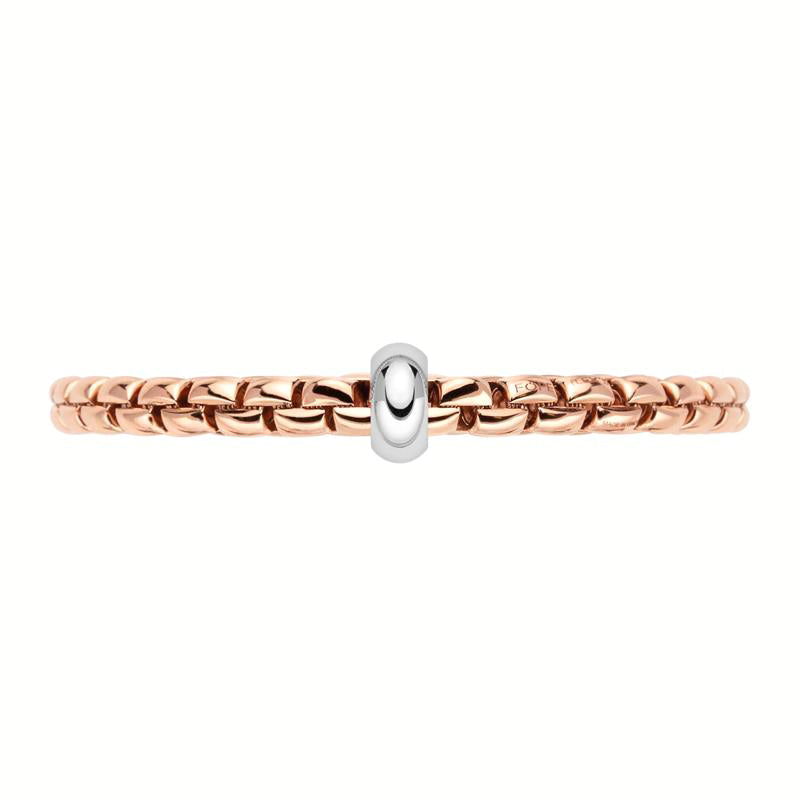 This Fope bracelet comes from the Eka collection. The flexible bracelet is finely crafted in 18ct Rose gold and features an 18ct white gold rondelle. This bracelet is clasp free for convenience.