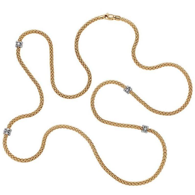 This Fope necklace comes from the Prima collection and is finely crafted from 18ct yellow gold. The necklace features a series of 18ct white gold rondelles, embellished with 0.49cts of sparkling brilliant cut diamonds, and moulds perfectly due to the Flex'it design. The piece is completed by a simple lobster clasp for convenient and secure wear.