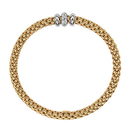 This stunning bracelet is part of the Fope Solo collection and features a finely crafted 18ct yellow gold Flex'it stretch design. The bracelet features three 18ct white gold rondelles, with the central rondelle embellished with 0.17cts of sparkling brilliant cut diamonds. This bracelet is clasp free for convenience.