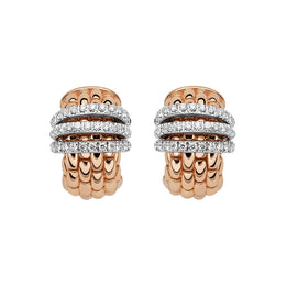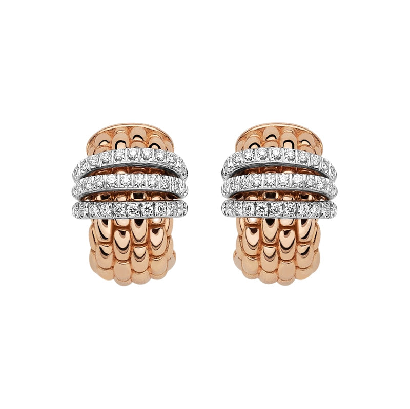 Part of the Panorama collection, these 18ct rose gold small hoop earrings embody simple modern elegance. Crafted in 18ct rose gold and hand finished with the recognisable and iconic Fope woven design, these earrings feature three rondelles crafted in 18ct white gold and beautifully embellished with 0.46cts of sparkling pave set diamonds. Completed with secure snap back fittings.