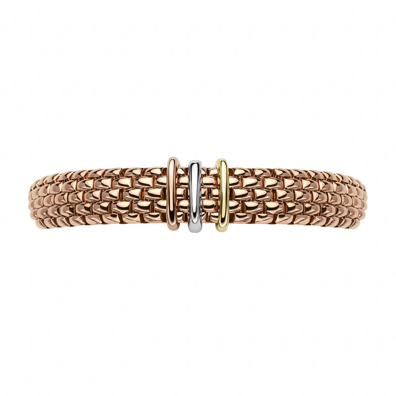Part of the Panorama collection, this bracelet has been finely crafted from 18ct rose gold and features three mixed rondelles in 18ct yellow, white and rose gold. Finished by hand, this stunning design features the recognisable Fope woven design that is seen featured throughout Fope jewellery. Using the innovative technique Fope is iconic for, this bracelet is flexible and easily stretches over the hand for easy and everyday wear.