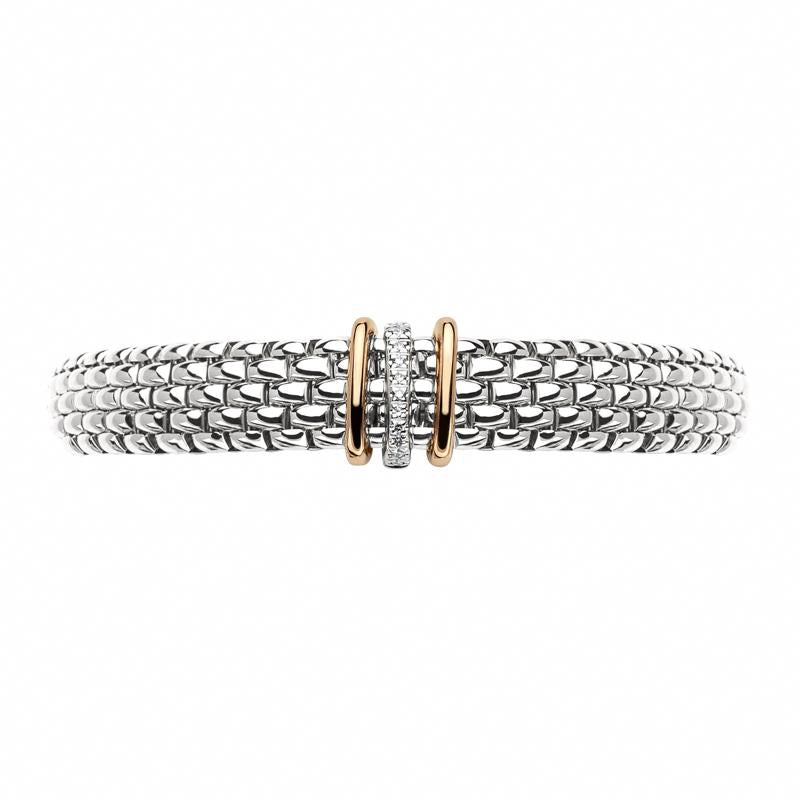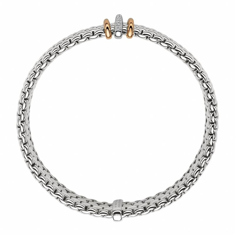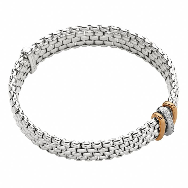 Part of the Panorama collection, this bracelet has been finely crafted from 18ct white gold and features three mixed rondelles in 18ct rose and white gold, elegantly embellished with 0.08cts of sparkling pave set diamonds. Finished by hand, this stunning design features the recognisable Fope woven design that is seen featured throughout Fope jewellery. Using the innovative technique Fope is iconic for, this bracelet is flexible and easily stretches over the hand for easy and everyday wear.