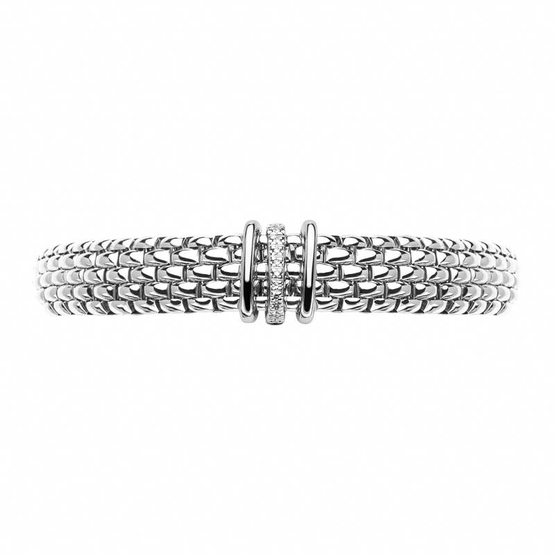 Part of the Panorama collection, this bracelet has been finely crafted from 18ct white gold and features three rondelles in 18ct white gold, elegantly embellished with 0.08cts of sparkling pave set diamonds. Finished by hand, this stunning design features the recognisable Fope woven design that is seen featured throughout Fope jewellery. Using the innovative technique Fope is iconic for, this bracelet is flexible and easily stretches over the hand for easy and everyday wear.