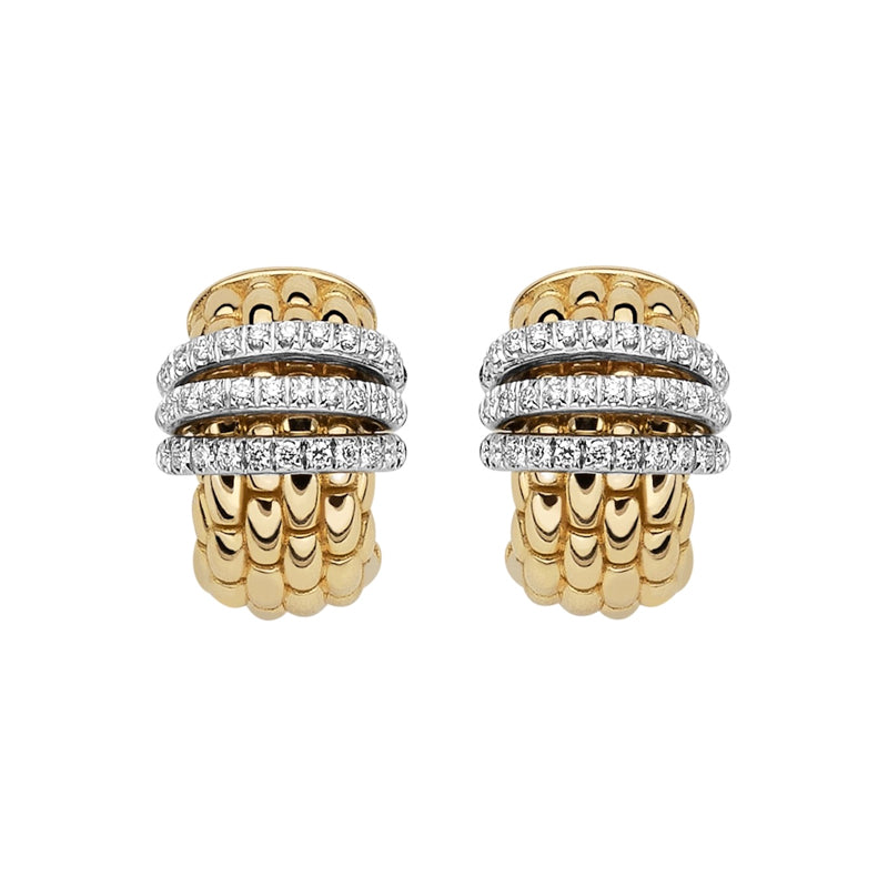 Part of the Panorama collection, these 18ct yellow gold small hoop earrings embody simple modern elegance. Crafted in 18ct yellow gold and hand finished with the recognisable and iconic Fope woven design, these earrings feature three rondelles crafted in 18ct white gold and beautifully embellished with 0.46cts of sparkling pave set diamonds. Completed with secure snap back fittings.