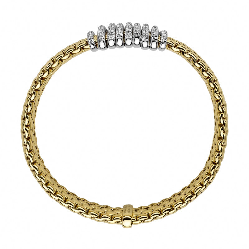 Part of the Panorama collection, this bracelet has been finely crafted from 18ct yellow gold and features eight rondelles crafted in 18ct white gold, all elegantly embellished with 0.68cts of sparkling pave set diamonds. Finished by hand, this stunning design features the recognisable Fope woven design that is seen featured throughout Fope jewellery. Using the innovative technique Fope is iconic for, this bracelet is flexible and easily stretches over the hand for easy and everyday wear.