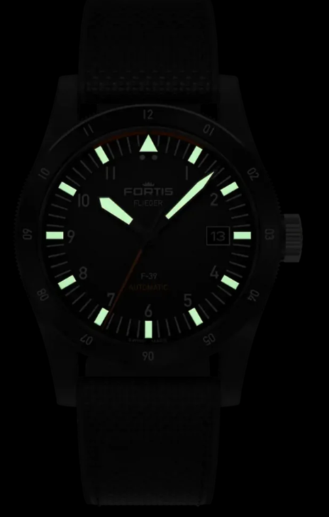 Fortis Flieger F-39 Tactical Green Watch F4220029. The heart of the Flieger lies in its groundbreaking Werk 7 calibre, a new era of precision and reliability at Fortis. With a 70-hour power reserve and a Variable-Inertia Regulation system, the Werk 7 ensures unwavering performance, delivering unparalleled timekeeping accuracy even in the harshest conditions.