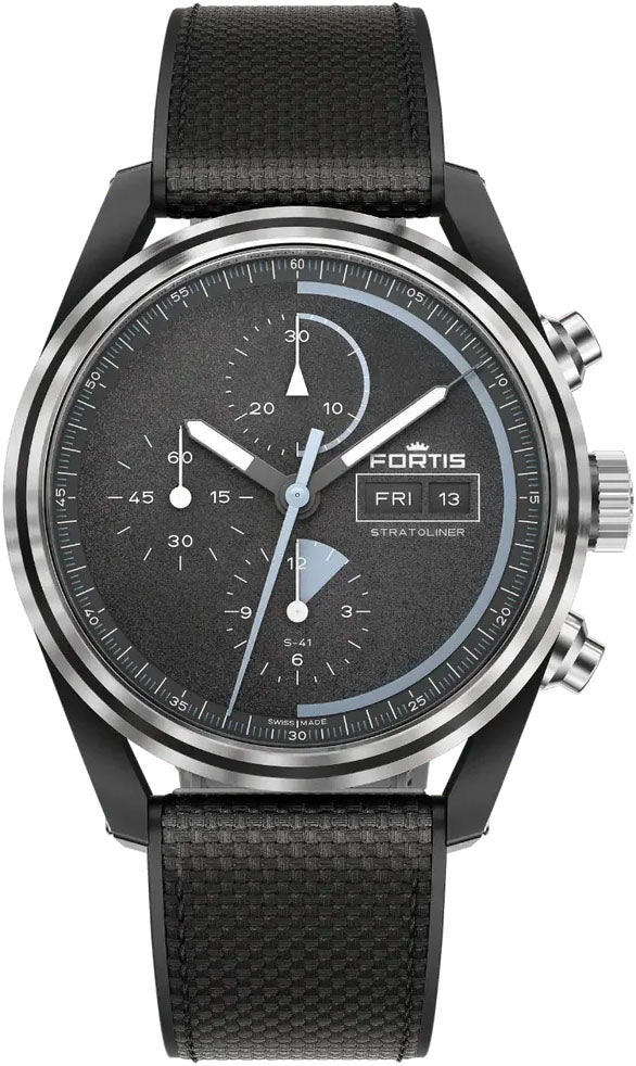 Fortis Stratoliner S-41 Gravity Black Watch F2340018. With the Stratoliner Gravity Black, Fortis presents the first-ever DLC coated case in the collection, setting a new standard in toughness, legibility and design clarity.Built for those who move ahead of their time. Engineered to endure where it matters most.