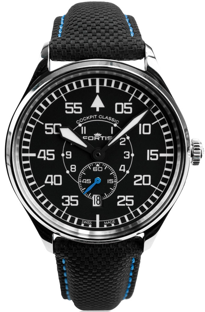 Fortis Watch Aviatis Cockpit Classic Second 901.20.51 LP.05. Flying inspires not only pilots but many people all around the world. Today, flying is part of our everyday lives yet it was always, and continues to be, people with a special pioneering spirit who push development onwards. FORTIS is one of these pioneering spirits which has spent centuries striving to develop perfection for pilots. The cockpit may be entirely digital today, but a watch remains a reliable companion with heart. And so it remains true today, that the most important instrument for a pilot is a mechanical watch. Based on this fundamental law of aviation, FORTIS set itself the goal of developing the best watches for flying. The core elements of such a watch were defined early on: Unparalleled, clear readability, double sided anti reflective sapphire glass and extreme pressure resistance. These features and ongoing further development have helped FORTIS in becoming the first choice for more than 60 flight squadrons, including the PC 7 Team of the Swiss Airforce.
