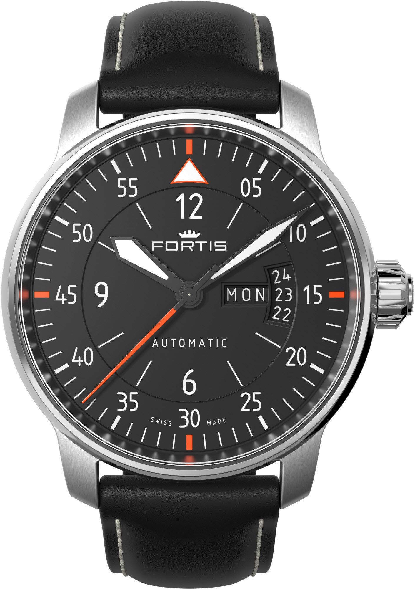 Fortis Watch Aviatis Cockpit Two 704.21.19 L.01. You might well say alarm in the cockpit. Thats how orange red the indices of the 704.21.19 Cockpit Two light up, with which Fortis breathes new life into a design classic. Gone is the age of large, colourful cockpit models. With the new interpretation of the 704.21.19 Fortis Cockpit Two, accents are only achieved by the orange red indices. With its wide cut date display and external minute display, Fortis reflects the true properties of a real cockpit.