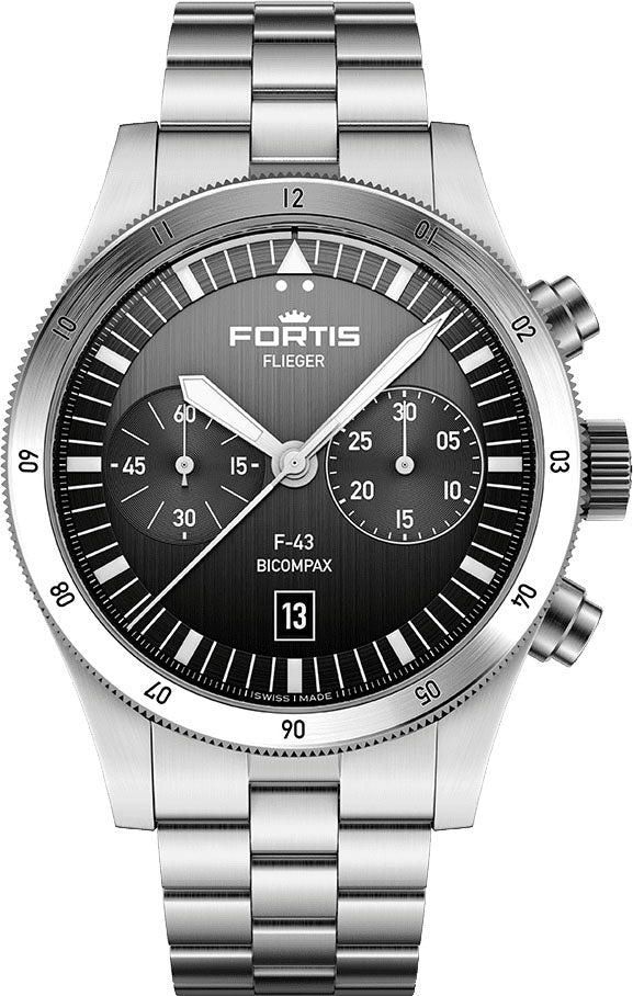 Fortis Watch Flieger F-43 Bicompax Black F4240006. The Flieger is one of the most iconic models amongst all aviation watches. First created in 1987 the Flieger embodies one of the cornerstones within the brands collection. A functional pilots tool. Repeatedly rewarded. Constantly developed.