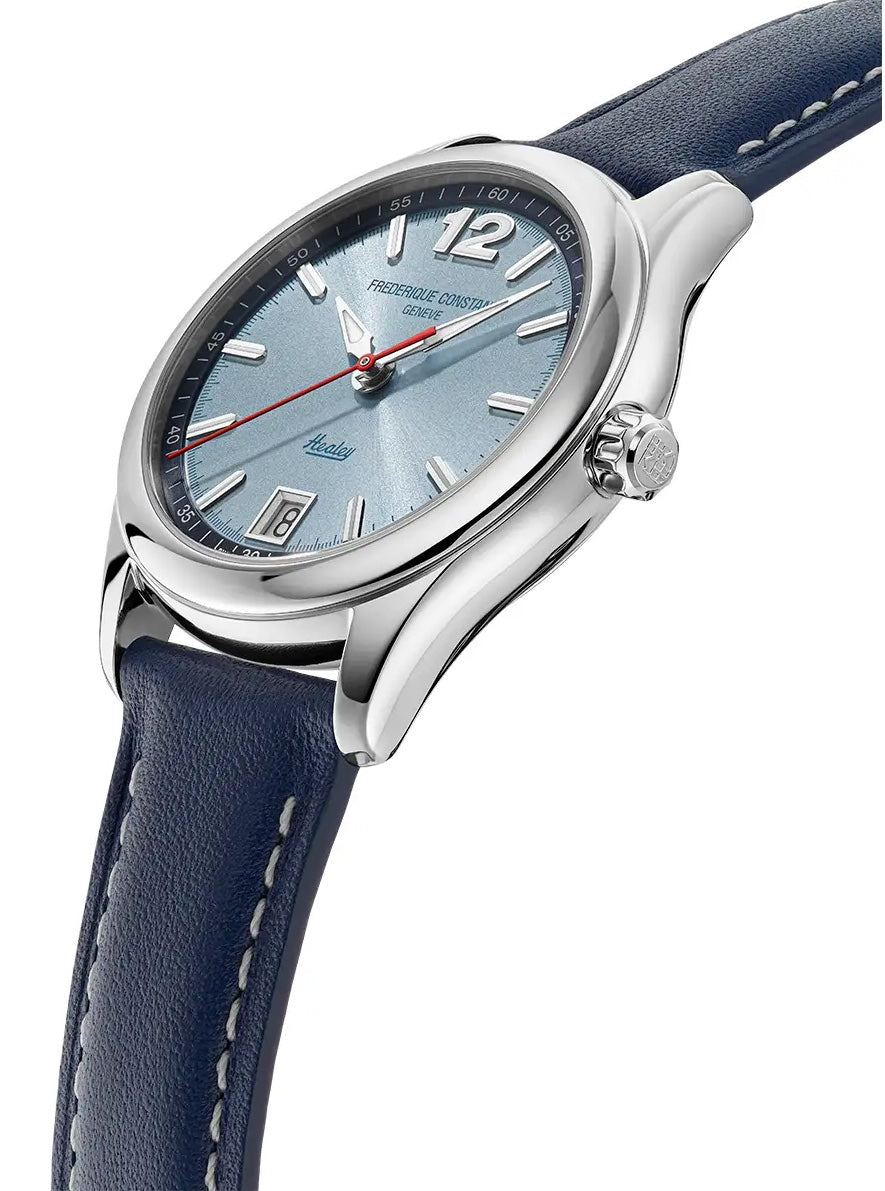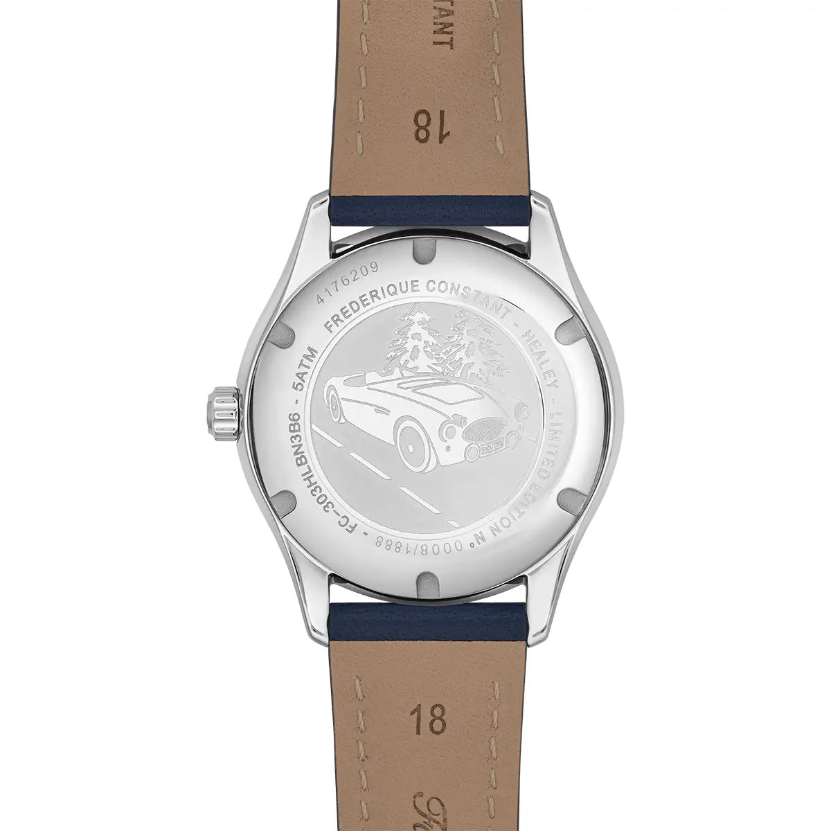 Frederique Constant Vintage Rally Healey Limited Edition Watch FC-303HLBN3B6. An exceptional vintage, discover the Classics Vintage Rally Healey. Collectors continue to appreciate the nod to Healey, a reference to one of the most iconic racing cars. Styled with a Healey blue dial with sunray finishing and Healey logo at 6 o’clock, paired with a navy blue calf leather with off-white stitching. Limited to 1,888 pieces worldwide.