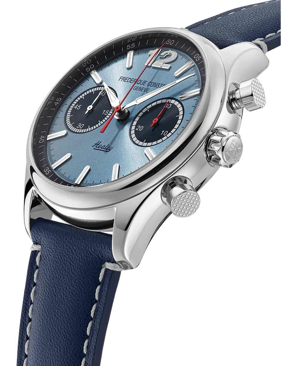 Frederique Constant Vintage Rally Healey Chronograph Limited Edition Watch FC-397HLBN5B6. An exceptional vintage, discover the Classics Vintage Rally Healey. Collectors continue to appreciate the nod to Healey, a reference to one of the most iconic racing cars. Styled with a Healey blue dial with sunray finishing and Healey logo at 6 o’clock, paired with a navy blue calf leather with off-white stitching.