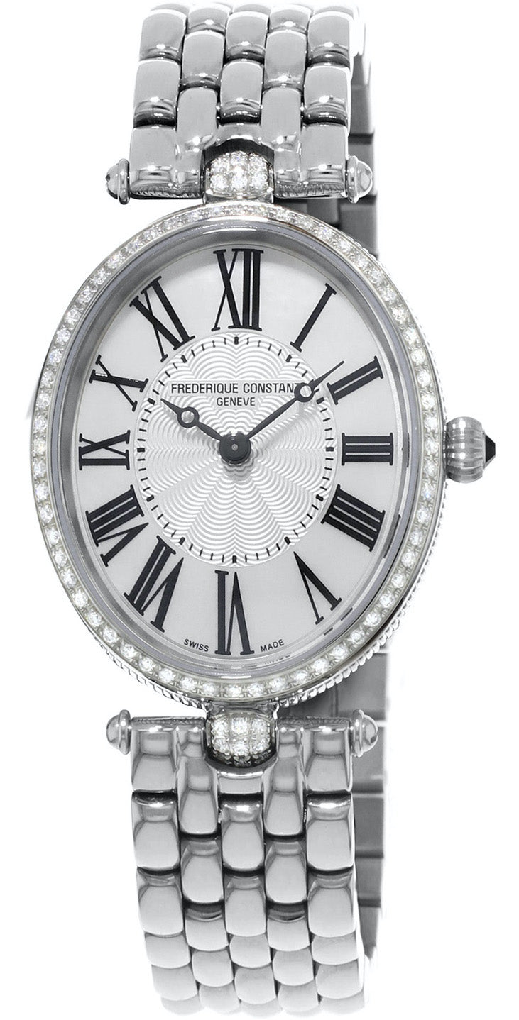Frederique Constant Watch Art Deco FC-200MPW2VD6B. This Frederique Constant diamond ladies watch on stainless steel bracelet culminates a stunning look from the iconic Classics collection. Its beautifully elegant guilloche centre piece communicates the high level of detailing involved within the manufacturing of Frederique Constant’s Swiss-sourced quartz timepiece. The black Roman numerals encircle the delicate art work carried out to the hour and minute hands, whilst the soft tones of the mother of pearl dial provide perfect legibility against the sharp colour contrast. The iconic Frederique Constant logo sits nobly above the centre point of the face, encompassed within a domed sapphire crystal glass exhibition glass front.