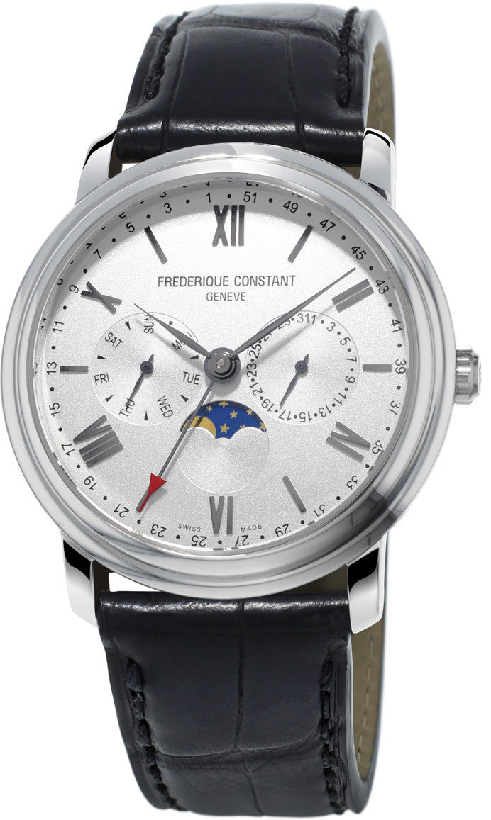 Frederique Constant Watch Classics Business Timer. This wristwatch from the Classics collection underpins ultimate professionalism via a collection of stunning features such as the moonphase, elegantly crafted in subtle tones of royal blue and rich gold, situated above the 6 o clock mark, and the three sub dials positioned with great care to achieve a perfect balance. The minute markers decorate the outer rim of the face of this Frederique Constant model, breaking up large Roman numerals that contrast beautifully against the striking red arrow tipped seconds hand and the smooth silver backdrop of the dial. The Quartz movement houses 5 jewels, provides 60 months of battery life and protects the watch from water depths of up to 60M. The fixed solid stainless steel bezel and matching pull and push crown leads up to a set of 20mm wide lugs accompanied by a luxurious black Frederique Constant calfskin leather strap with pin buckle. Supplier model number FC-270SW4P6