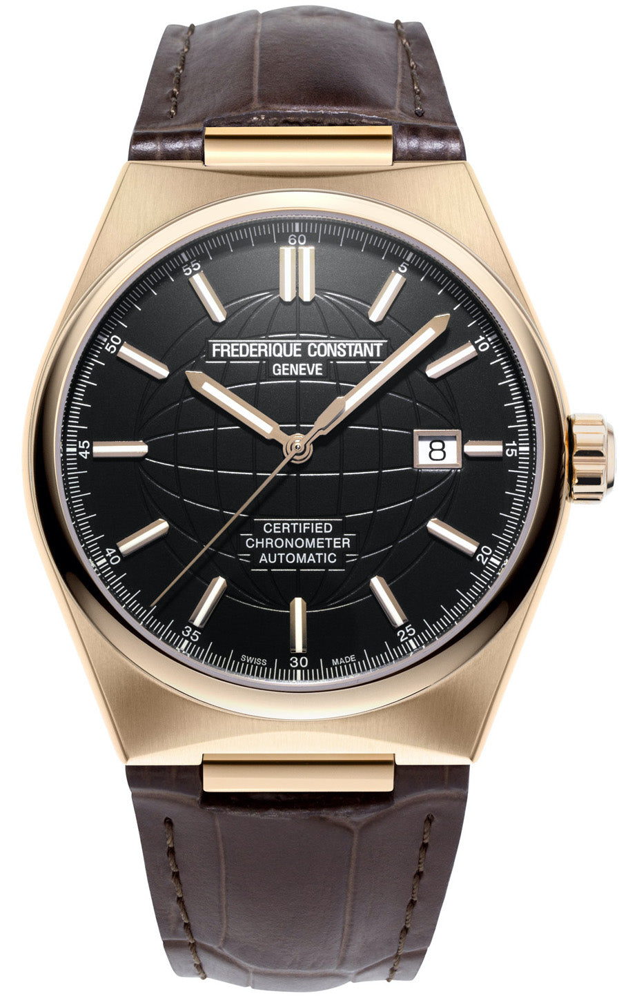Frederique Constant Watch Highlife FC-303B4NH4. The Highlife certified COSC timepiece is a unique movement to the brand that has passed the rigours of testing for accuracy by Swiss Chronometer Testing Institute. The rose gold plated stainless steel case features a distinguished embossed globe pattern on the dial. This timepiece features a bold black dial on a complimentary padded brown leather strap. This piece comes with an additional rubber strap to give the model a more casual look.