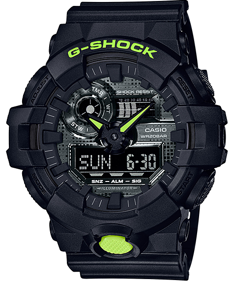 G-Shock Watch Camouflage Mens GA-700DC-1A. This G-SHOCK model features digital camouflage pattern on metallic face that result in subdued designs. Base model is GA-700, the analog-digital timepieces. The basic black coloring of this model is offset by vivid yellow accents for a cool look.
