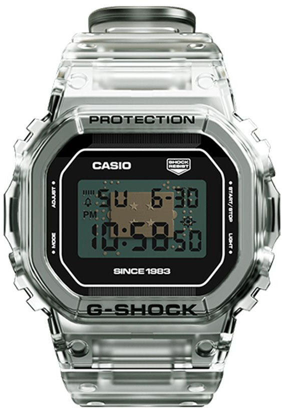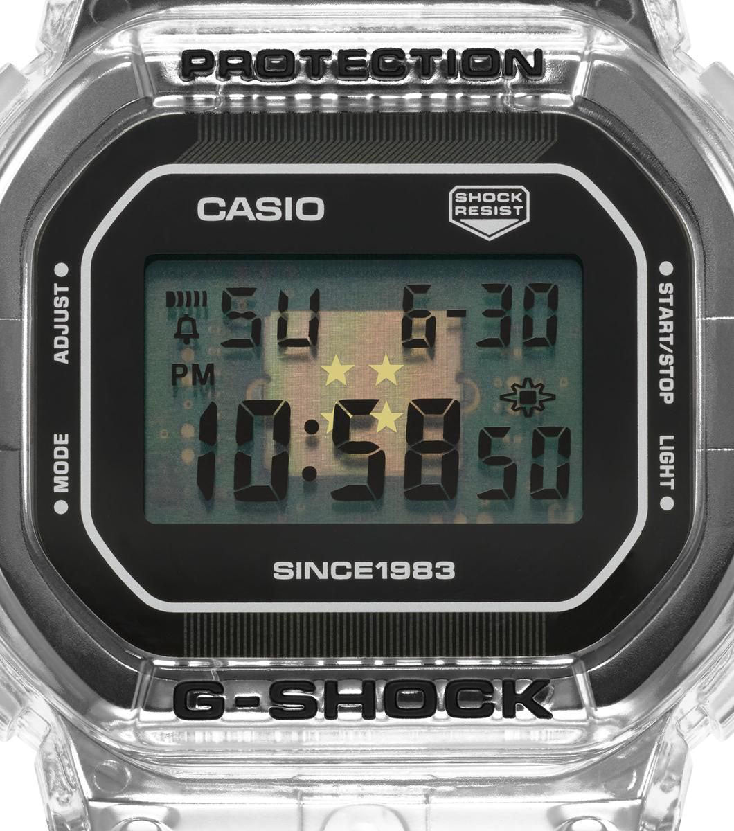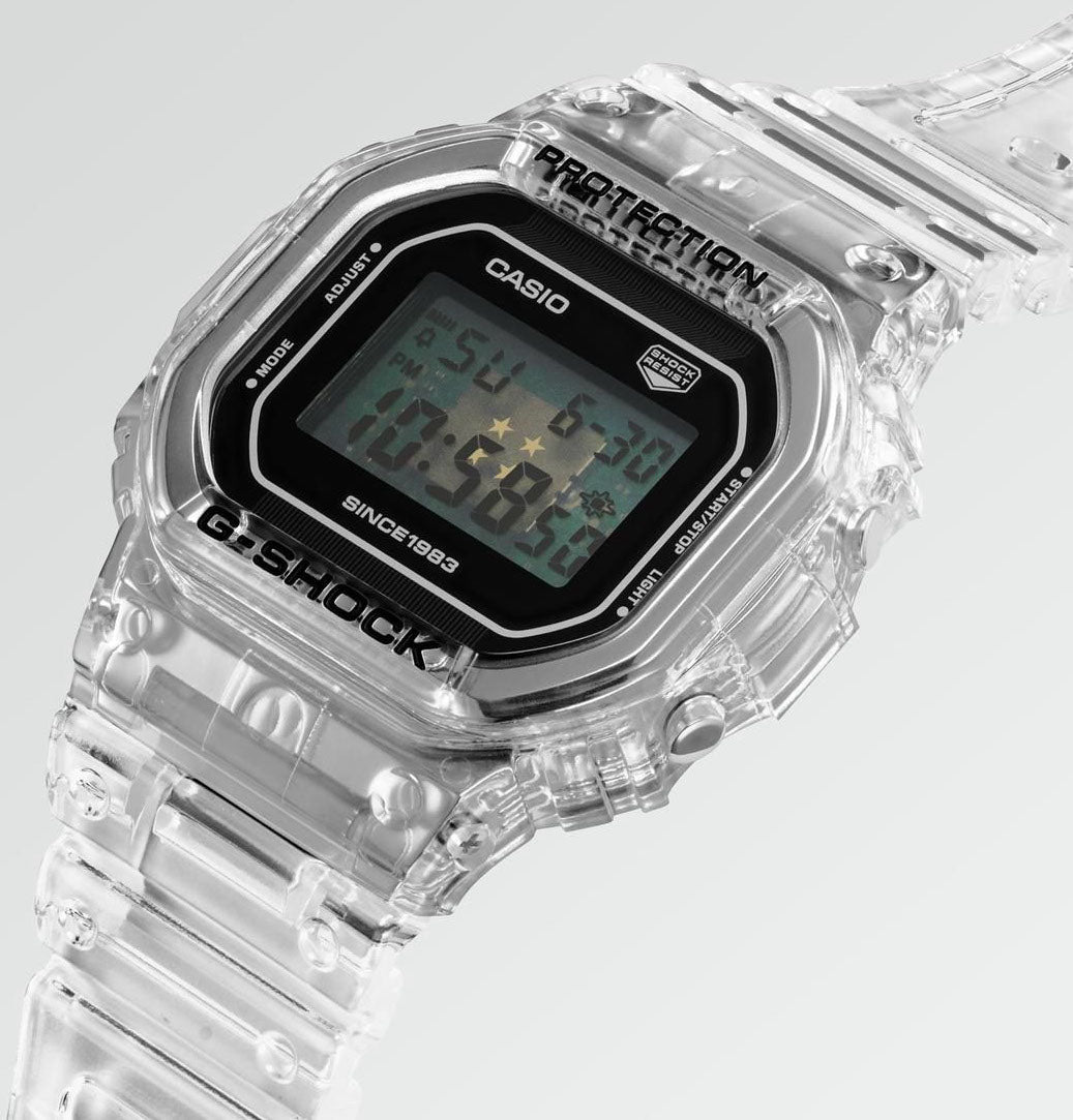 G-Shock Watch Clear Remix DW-5040RX-7ER. For the 40th anniversary of G-SHOCK, the Clear Remix Collection gives you even more. The strap, case, dial, LCD and buttons are made of transparent materials, giving you an unobstructed view of the G-SHOCK branded module. The case back features the Eric Haze 40th Anniversary logo and the band loop is engraved with four stars to commemorate this special anniversary. These details and the new transparent housing made of clear fiberglass create a unique design worthy of an incomparable limited edition G-SHOCK.